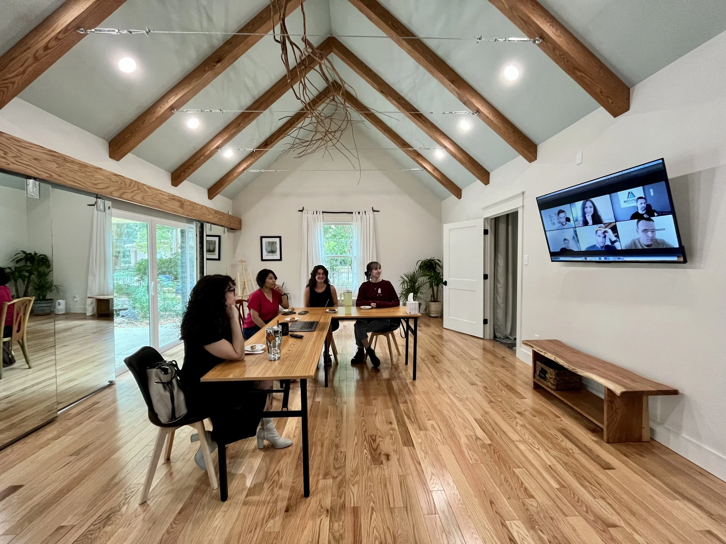 Searching for a fresh space to gather your team, teach a workshop, or host a client session? Our studio workspace has tables and chairs, seats up to 20, and features built-in Sonos speakers connected to the TV for easy online connections.